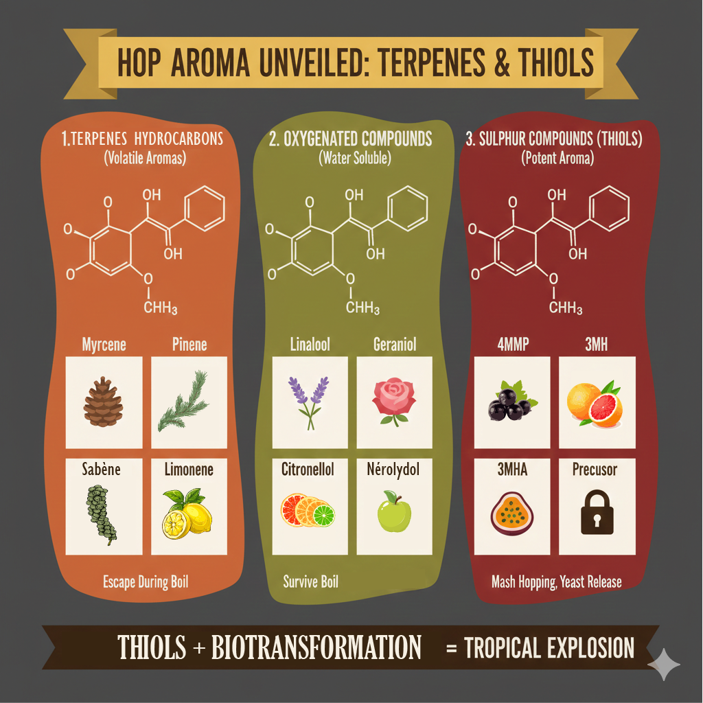 Les composés aromatiques du houblon sont extrêmement complexes et variés. On en dénombre plus de 500, mais ils se classent principalement en trois grandes familles chimiques.