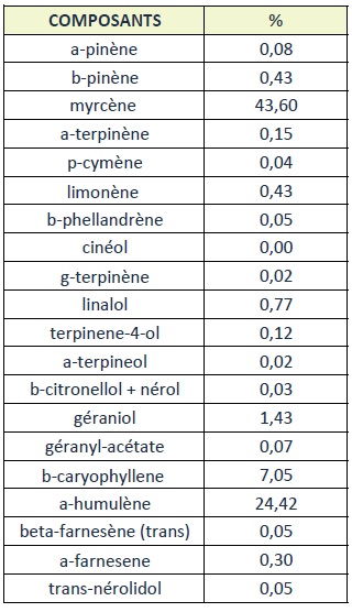 Myrcène (43,60 %) : Apporte une attaque très fraîche sur le pin et les zestes d'agrumes.